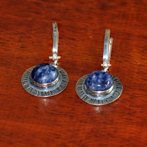 СРЕБЪРНИ ОБЕЦИ СЪС СОДАЛИТ, РЪЧНА ИЗРАБОТКА.ГОЛЕМИНА НА КАМЪКА – 9 мм., ДИАМЕТЪР НА ОБЕЦАТА 1.8 см. АНГЛИЙСКО ЗАКОПЧАВАНЕ.