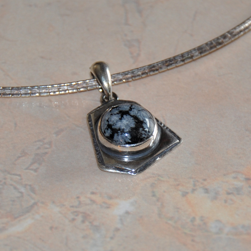 СРЕБЪРЕН МЕДАЛЬОН СЪС СНЕЖЕН ОБСИДИАН, РЪЧНА ИЗРАБОТКА.ГОЛЕМИНА НА КАМЪКА – 11 мм., ГОЛЕМИНА НА МЕДАЛЬОНА – 3/1.7 см.