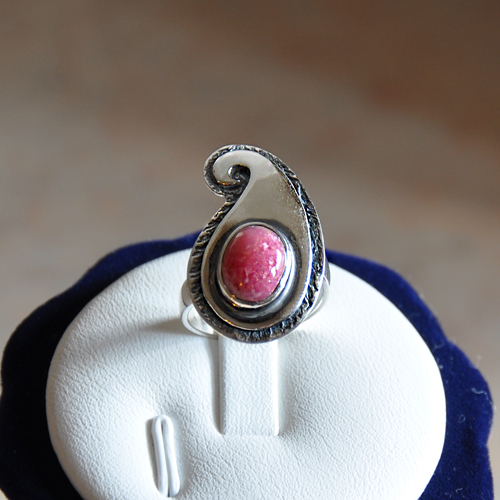 СРЕБЪРЕН ПРЪСТЕН С РОДОНИТ, РЪЧНА ИЗРАБОТКА.ГОЛЕМИНА НА КАМЪКА – 9/7 мм., ГОЛЕМИНА НА ПРЪСТЕНА 2.4/1.5 см., РАЗМЕР НА ПРЪСТЕНА 50.ЗАБЕЛЕЖКА: ПРЪСТЕНЪТ Е С ПОДВИЖНА ВРЪЗКА ПОЗВОЛЯВАЩА РАЗШИРЯВАНЕТО МУ С ДО ДВА РАЗМЕРА!