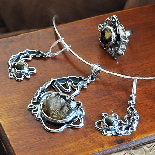 СРЕБЪРЕН КОМПЛЕКТ С ОПАЛИЗИРАЛО ДЪРВО В АСИМЕТРИЧНА ФОРМА, РЪЧНА ИЗРАБОТКА, СЪСТОЯЩ СЕ ОТ МЕДАЛЬОН, ПРЪСТЕН И ОБЕЦИ.