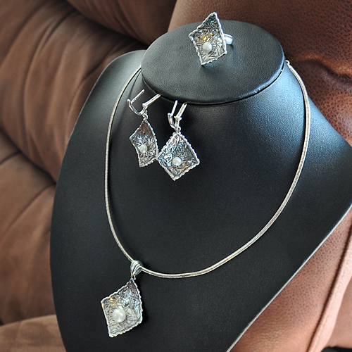 СРЕБЪРЕН КОМПЛЕКТ С РЕЧНА ПЕРЛА, РЪЧНА ИЗРАБОТКА, СЪСТОЯЩ СЕ ОТ МЕДАЛЬОН, ПРЪСТЕН И ОБЕЦИ.
