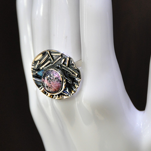 СРЕБЪРЕН ПРЪСТЕН С РОДОНИТ, РЪЧНА ИЗРАБОТКА.ГОЛЕМИНА НА КАМЪКА – 11 мм., ДИАМЕТЪР НА ПРЪСТЕНА 2.5 см., РАЗМЕР НА ПРЪСТЕНА 54.ЗАБЕЛЕЖКА: ПРЪСТЕНЪТ Е С ПОДВИЖНА ВРЪЗКА ПОЗВОЛЯВАЩА РАЗШИРЯВАНЕТО МУ С ДО ДВА РАЗМЕРА!