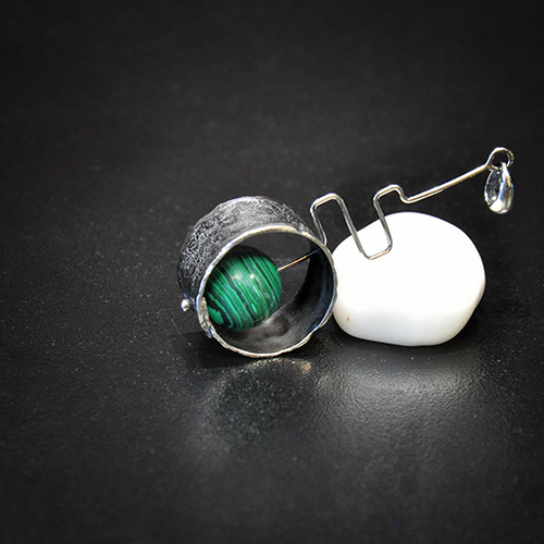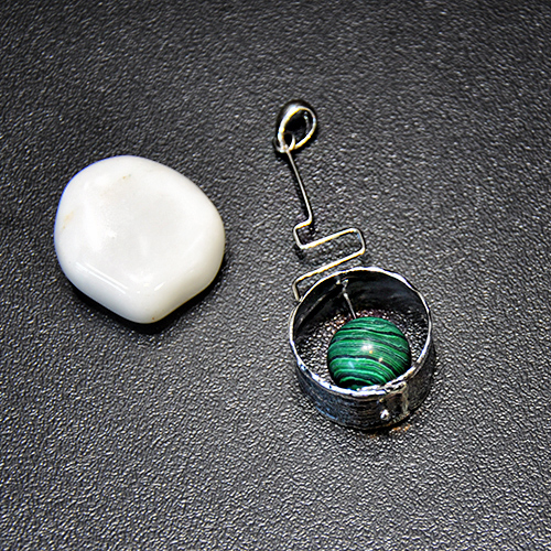 СРЕБЪРЕН МЕДАЛЬОН С МАЛАХИТ, РЪЧНА ИЗРАБОТКА.ДИАМЕТЪР НА КАМЪКА – 13 мм., ДИАМЕТЪР НА МЕДАЛЬОНА – 2.2 см., ДЪЛЖИНА – 5.9 см., ШИРИНА - 1.8 см