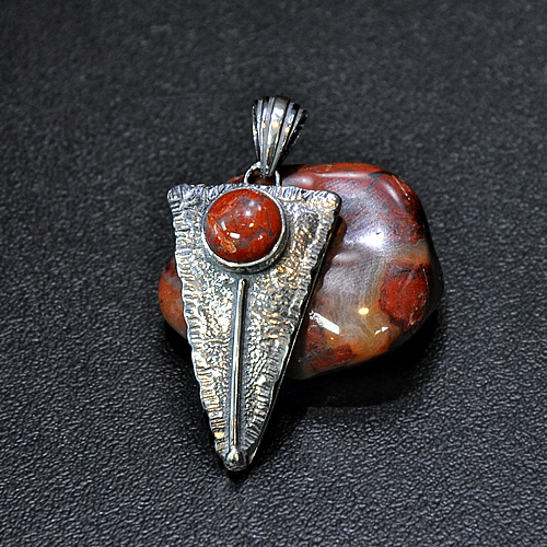 СРЕБЪРЕН МЕДАЛЬОН С МАРОКАНСКИ ЯСПИС, РЪЧНА ИЗРАБОТКА.ГОЛЕМИНА НА МЕДАЛЬОНА – 3.6/2.2 см.ДИАМЕТЪР НА КАМЪКА 9 мм.
