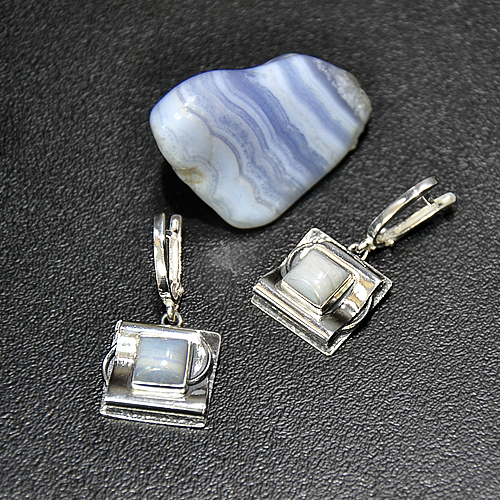 СРЕБЪРНИ ОБЕЦИ С АХАТ „БЛУ ЛЕЙС“, РЪЧНА ИЗРАБОТКА.ГОЛЕМИНА НА ОБЕЦАТА – 1.8/1.8 см. ГОЛЕМИНА НА КАМЪКА 7/7 мм. АНГЛИЙСКО ЗАКОПЧАВАНЕ.
