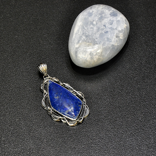 СРЕБЪРЕН МЕДАЛЬОН С ЛАЗУРИТ И АЖУРНИ МОТИВИ, РЪЧНА ИЗРАБОТКА.ГОЛЕМИНА НА КАМЪКА – 40/19 мм., ГОЛЕМИНА НА МЕДАЛЬОНА – 4.7/3.2 см.