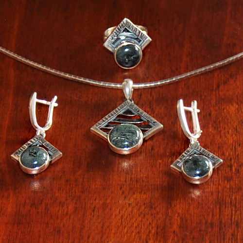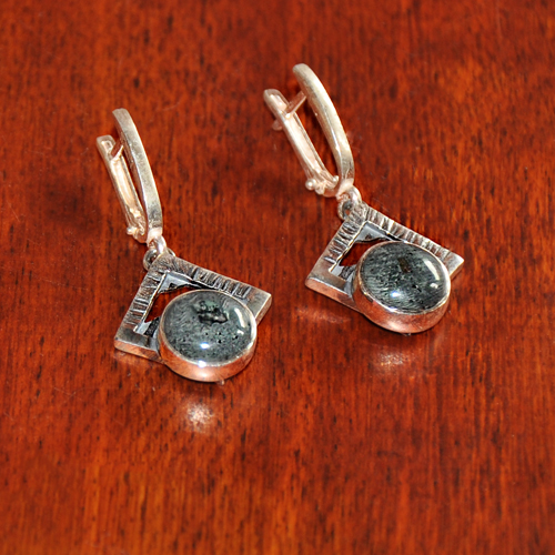 СРЕБЪРНИ ОБЕЦИ С ТУНГУАИТ, РЪЧНА ИЗРАБОТКА.ГОЛЕМИНА НА КАМЪКА – 9 мм., ГОЛЕМИНА НА ОБЕЦАТА 2/1.7 см.АНГЛИЙСКО ЗАКОПЧАВАНЕ.