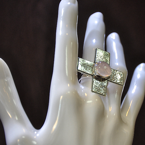 СРЕБЪРЕН ПРЪСТЕН ВЪВ ФОРМАТА НА КРЪСТ, С РОЗОВ КВАРЦ, РЪЧНА ИЗРАБОТКА.ГОЛЕМИНА НА ПРЪСТЕНА – 3.5/3.5 см., НА КАМЪКА 11 мм.РАЗМЕР НА ПРЪСТЕНА 58, КОРИГИРАЩА ХАЛКА.