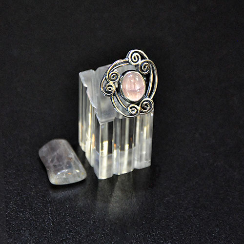 СРЕБЪРЕН ПРЪСТЕН С РОЗОВ КВАРЦ, РЪЧНА ИЗРАБОТКА. ГОЛЕМИНА НА ПРЪСТЕНА 2.3/1.3 см., ГОЛЕМИНА НА КАМЪКА – 11/9 мм.РАЗМЕР НА ПРЪСТЕНА 53, КОРИГИРАЩА ХАЛКА.