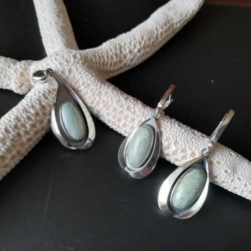 СРЕБЪРЕН КОМПЛЕКТ С АМАЗОНИТ, СЪСТОЯЩ СЕ ОТ МЕДАЛЬОН И ОБИЦИ.ГОЛЕМИНА НА МЕДАЛЬОНА 2.5/1.6 см., ГОЛЕМИНА НА КАМЪКА 16/8 мм.ГОЛЕМИНА НА ОБИЦАТА 2/1.3 см., ГОЛЕМИНА НА КАМЪКА 16/8 мм.